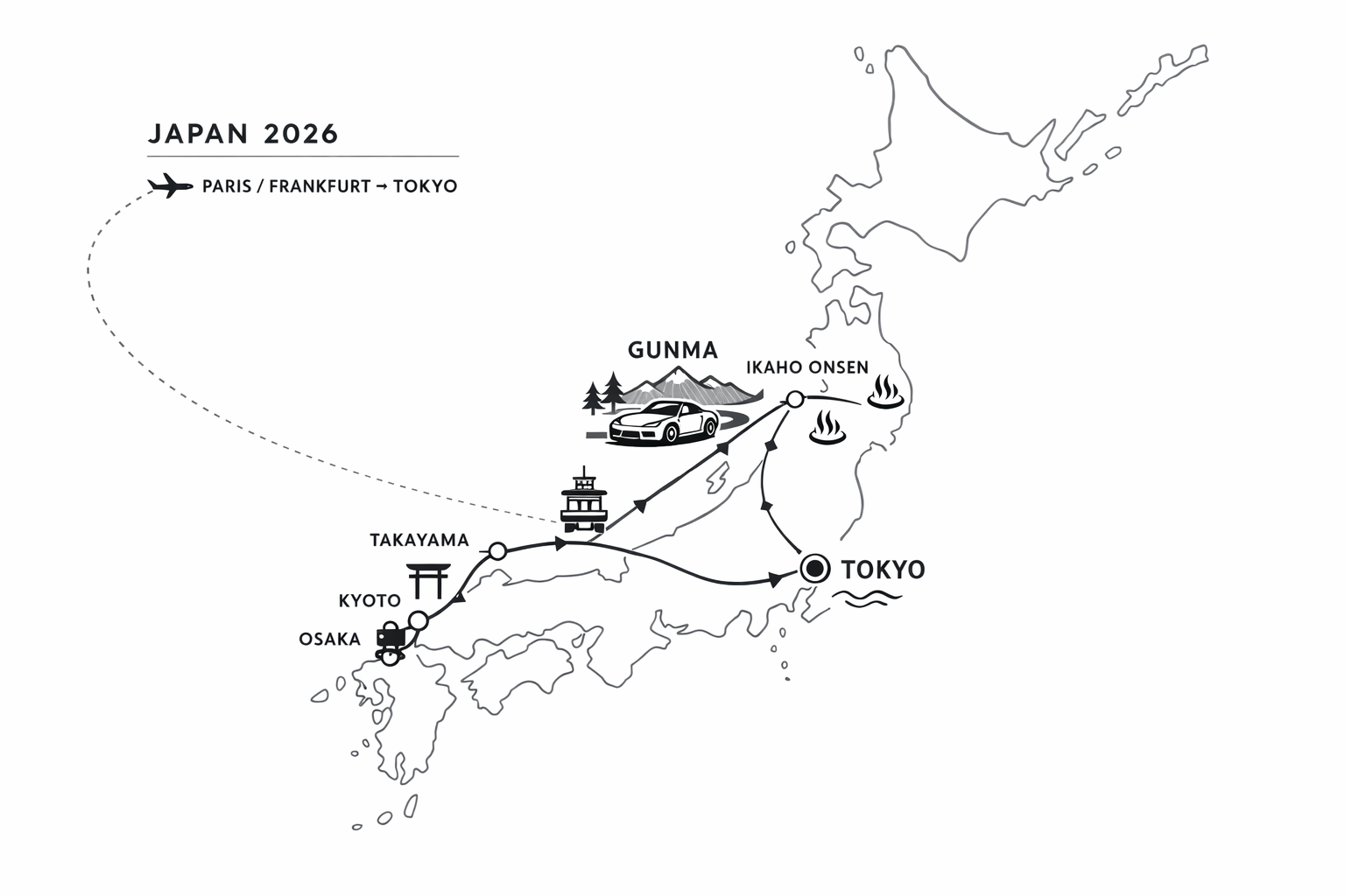 Berge, Onsen, Touge-Straßen, authentisches ländliches Japan, Festival. Die Phase beginnt mit den Onsen von Gunma — dann szenischer Bus durch Nagano nach Takayama, ohne Rückkehr nach Tokyo.