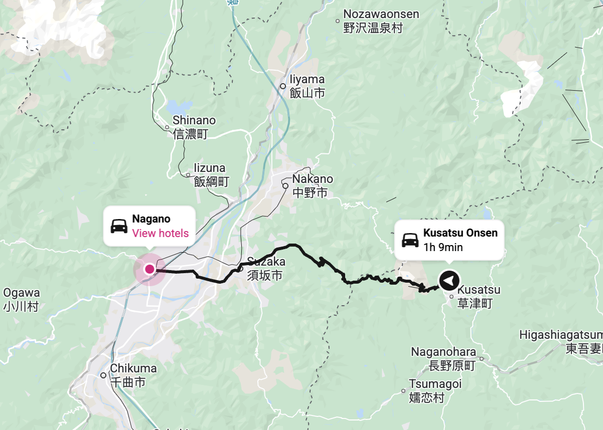 - Busse: Kusatsu → Nagano · Nagano → Takayama · Takayama → Kyoto · Osaka → Tokyo
