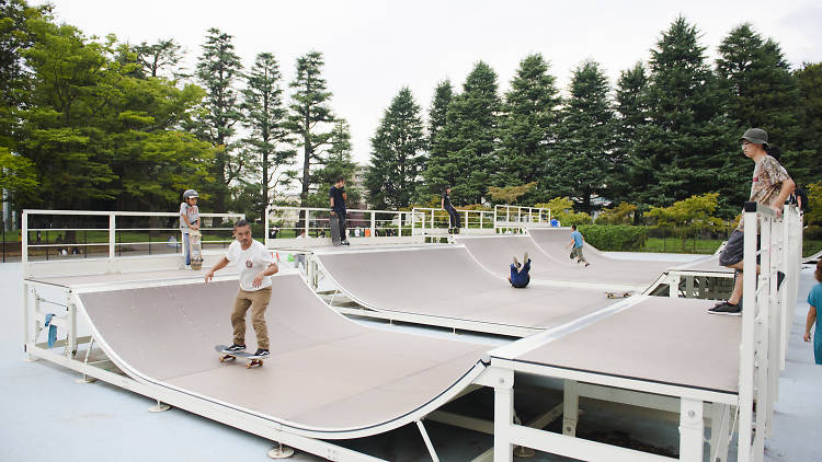 Komazawa Olympic Park — ikonischer kostenloser Skatepark: manny pads, quarter pipes, mini halfpipe. 10:00–19:00. FREE.