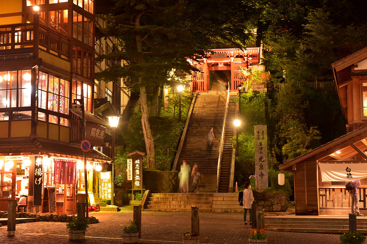 Bus Shinjuku → Ikaho: ¥2.800–3.100, 2,5 Stunden (Kan-Etsu Expressway Bus). Bergstädtchen, 365 Steinstufen, goldenes Wasser (eisenhaltiges Wasser, bernsteinfarben an der Luft).